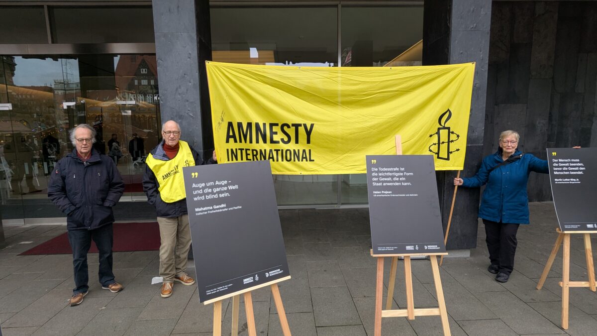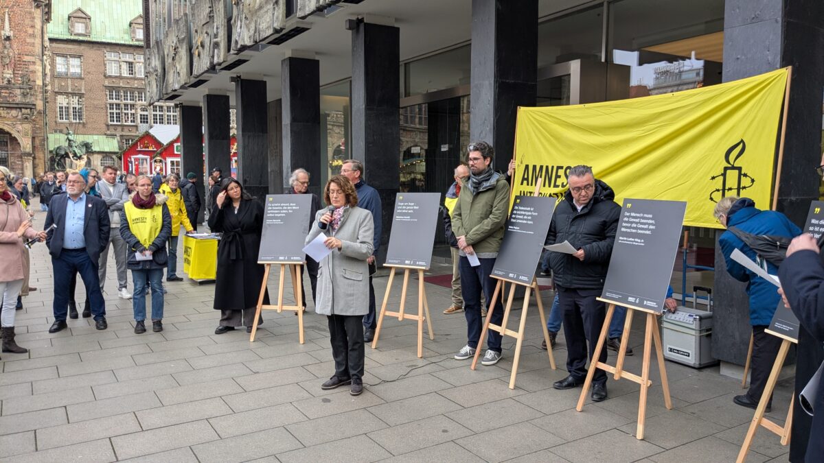 In Bremen fand der Aktionstag am Mittwoch, 10.12. um 13 Uhr vor dem Eingang der Bürgerschaft statt als Kooperation der Bremischen Bürgerschaft mit Amnesty International. Nach den Ansprachen von Bürgerschaftspräsidentin Antje Grotheer und Nele Reichert von Amnesty International wurden von Mitgliedern der verschiedenen Fraktionen der Bürgerschaft 6 aktuelle Todesstrafenfälle vorgestellt und Informationen zum Thema geliefert. Dazu wurden Briefe und Petitionslisten ausgelegt, um Hinrichtungen zu verhindern und die Abschaffung dieser grausamen Strafe zu fordern.